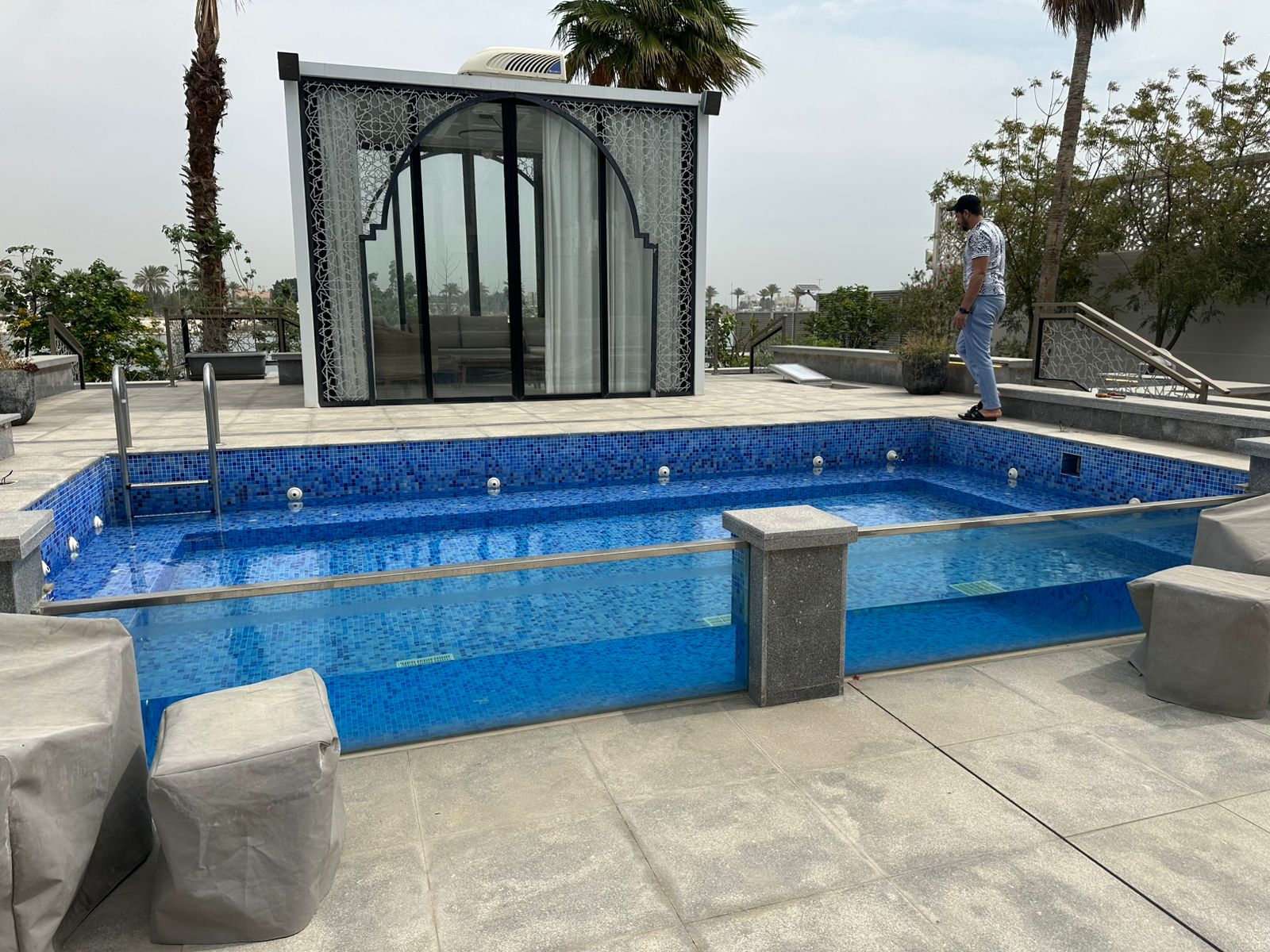 - اختبار الضغط والتسرب: ملء المسبح بالماء وإجراء اختبارات دقيقة لجميع أنظمة السباكة والفلترة للتأكد من عدم وجود أي تسريبات أو مشاكل تشغيلية.