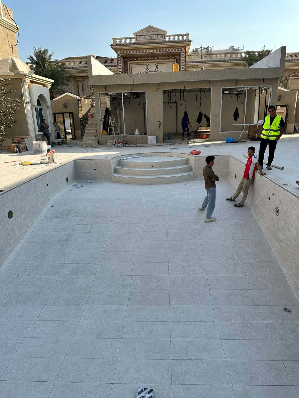- تركيب السيراميك أو البلاط: يتم تركيب البلاط أو السيراميك الخاص بالمسابح على الجدران والأرضيات باستخدام مواد لاصقة مقاومة للماء والمواد الكيميائية. تتطلب هذه المرحلة دقة عالية في القياس والتركيب.